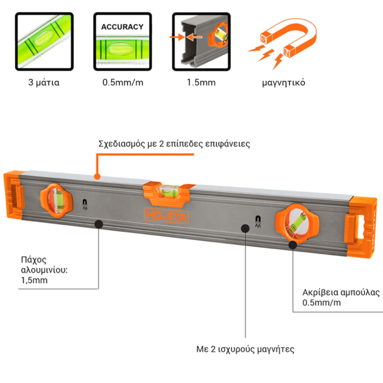 >Πλαίσιο αλουμινίου υψηλής ποιότητας >Με 2 ισχυρούς μαγνήτες >Ακρίβεια αμπούλας: 0,5mm/m >Πάχος αλουμινίου: 1,5mm >Σχεδιασμός με δύο επίπεδες επιφάνειες 3 μάτια υψηλής ευκρίνειας >Μήκος: 120cm