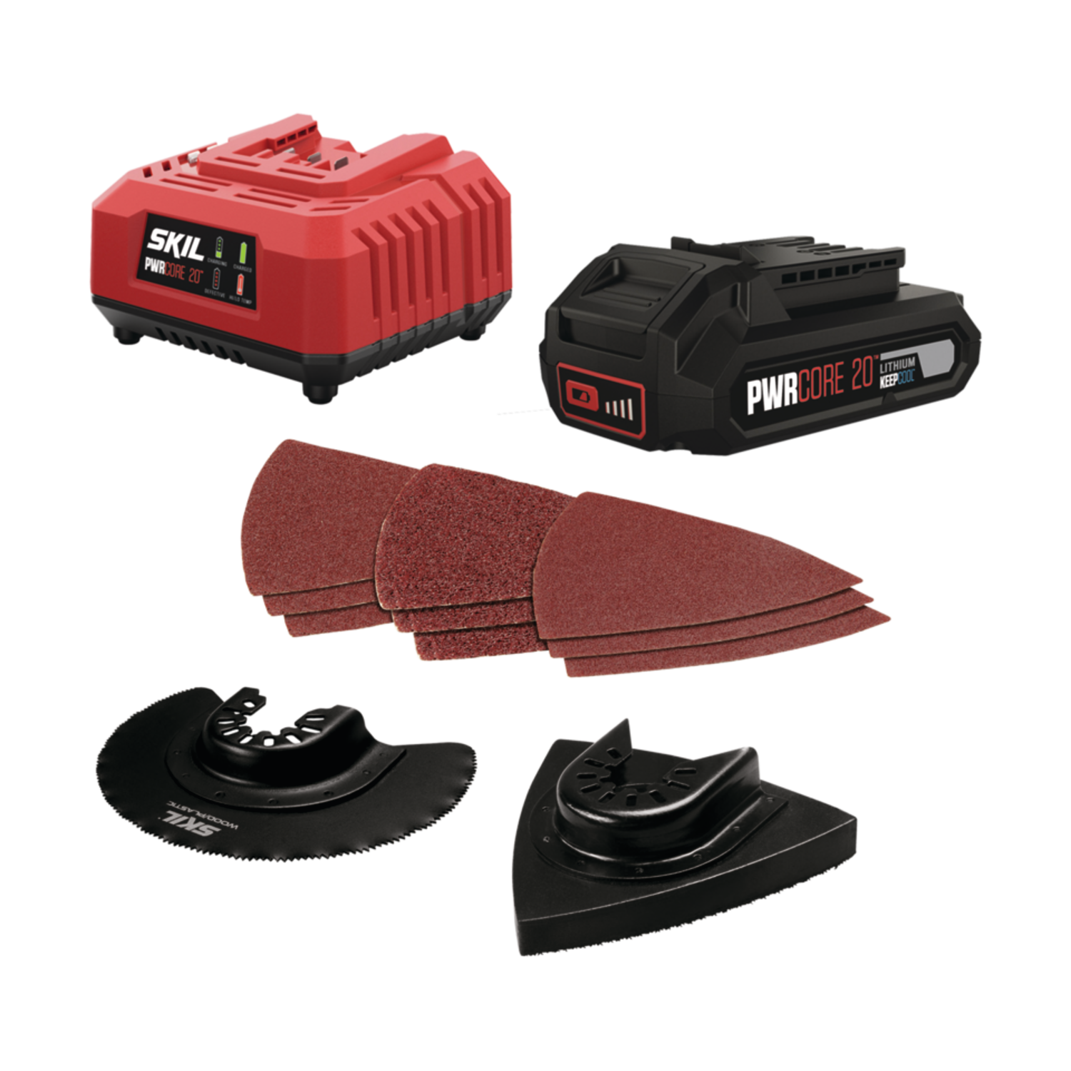 Περιλαμβάνονται πέλμα λείανσης, πριονόλαµα τοµέα HCS, διµεταλλική πριονόλαµα βυθιζόµενης κοπής, 9 φύλλα λείανσης (P60 x3, P120 x3, P180 x3)