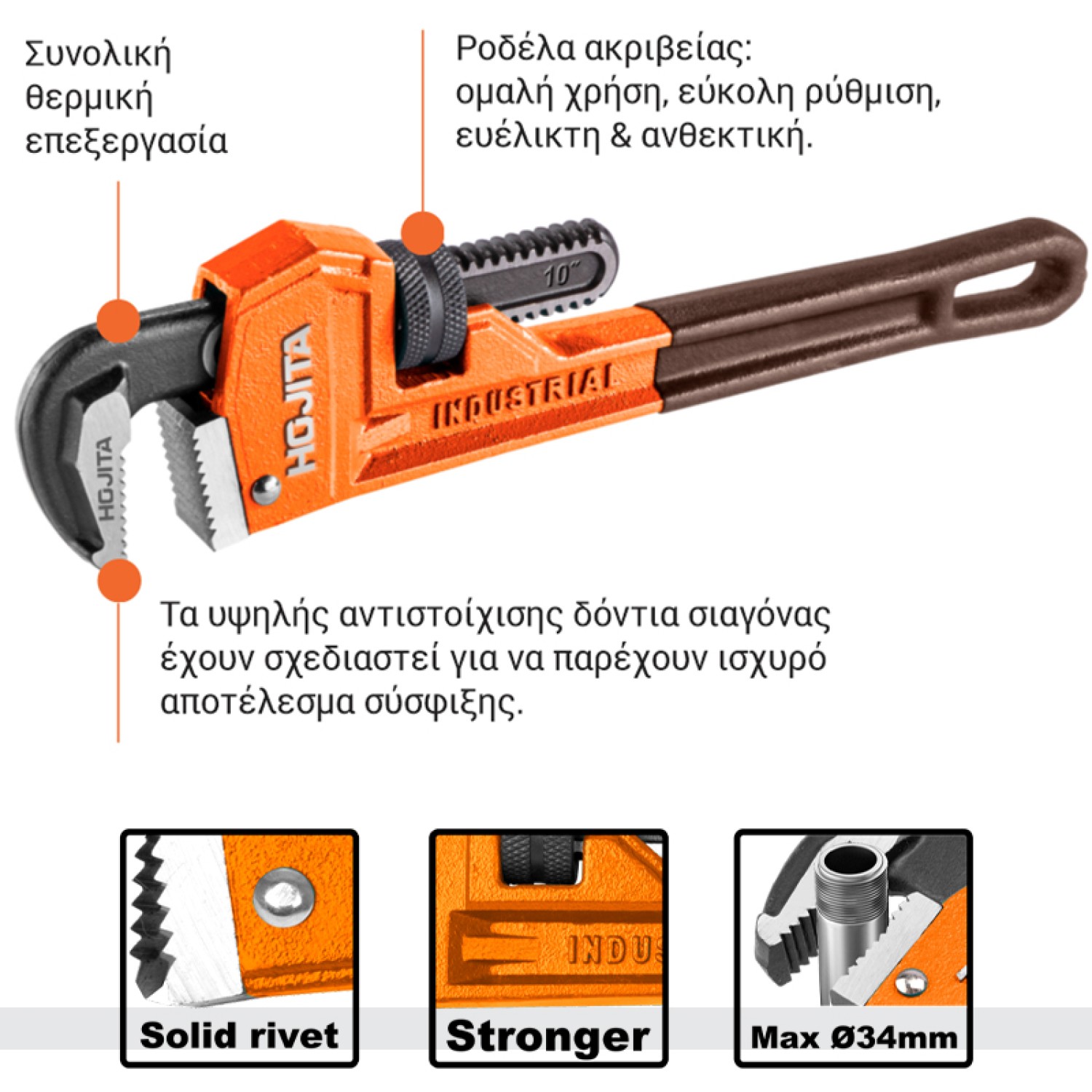 >Μέγεθος: 350mm/ 14" >Μέγιστη διάμετρος σύσφιξης: 50mm >Κινητή σιαγόνα σφυρηλατημένη από υψηλής ποιότητας ανθρακούχο χάλυβα >Αντιδιαβρωτική επεξεργασία >Υλικό σώματος: όλκιμο χυτοσίδηρο >Μαύρο φινίρισμα και γυάλισμα >Το σώμα του εργαλείου κατασκευάζεται ως ένα ενιαίο κομμάτι, χωρίς συγκολλήσεις ή συνδέσεις.